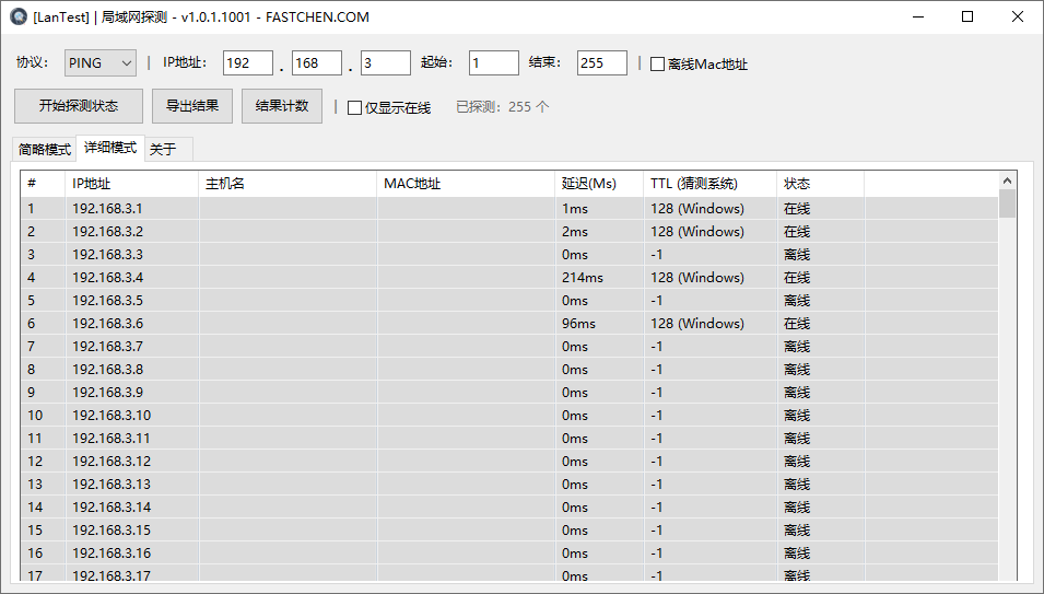 <figure><img src="https://3120800205-files.gitbook.io/~/files/v0/b/gitbook-x-prod.appspot.com/o/spaces%2FBw0VwoV0yDZshBzmKvNc%2Fuploads%2Fgit-blob-620077c388f285f9843b710e1a206bec89fc754d%2Flantest_detail.png?alt=media" alt=""><figcaption><p>局域网探测 | 详细模式</p></figcaption></figure>