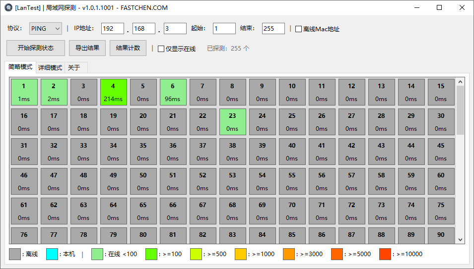 <figure><img src="https://3120800205-files.gitbook.io/~/files/v0/b/gitbook-x-prod.appspot.com/o/spaces%2FBw0VwoV0yDZshBzmKvNc%2Fuploads%2Fgit-blob-67be09df2ca257f896237d7b4599644c0de5d108%2Flantest_main.png?alt=media" alt=""><figcaption><p>局域网探测 | 简略模式</p></figcaption></figure>