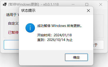<figure><img src="https://3120800205-files.gitbook.io/~/files/v0/b/gitbook-x-prod.appspot.com/o/spaces%2FBw0VwoV0yDZshBzmKvNc%2Fuploads%2Fgit-blob-37360fd5b5a37787fe130592cc001f0bf01727c7%2Fpause-windows-update_2.png?alt=media" alt=""><figcaption><p>启用暂停成功通知</p></figcaption></figure>