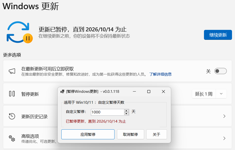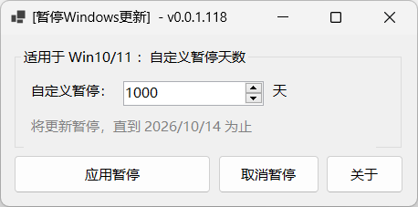 一个可以快捷自定义 Windows 暂停更新天数的工具，实现基本永久的禁用更新。